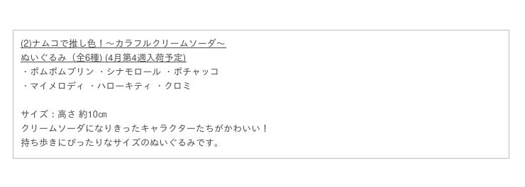 株式会社バンダイナムコアミューズメントは、株式会社サンリオが開催する人気投票企画「2023年サンリオキャラクター大賞」と連動した『ナムコで推し色!~カラフルクリームソーダ~』キャンペーンを、2023年4月21日(金)から5月28日(日)まで、全国約200店舗の直営アミューズメント施設「namco」とネットクレーンモール「とるモ」で開催します。