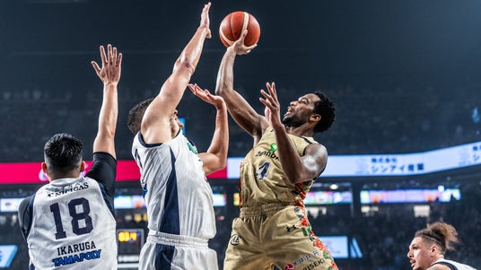 群馬は平均失点72.3点と、リーグで3番目に少ない失点数を誇る堅守速攻のチームです。注目選手の一人、#4 トレイ・ジョーンズ選手(平均14.7得点)を中心とした多彩な攻撃パターンで得点を重ねます。また、ゴール下では#32 ヨハネス・ティーマン選手が平均7.9リバウンドと存在感を発揮しています。さらに、2021-23シーズンにキングスに所属し、2022-23シーズンの優勝に大きく貢献した#1 コー・フリッピン選手も所属しており、#1 フリッピン選手の爆発力は試合の流れを大きく変える力があります。