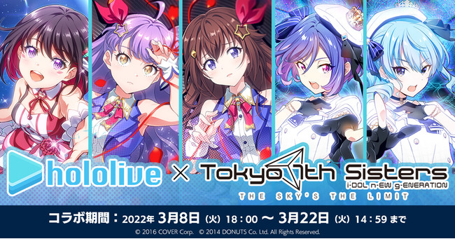 株式会社DONUTS(本社:東京都渋谷区、代表取締役:西村啓成、以下DONUTS)が、App Store及びGoogle Playにて提供中のスマートフォン向けゲームアプリ「Tokyo 7th シスターズ THE SKY’S THE LIMIT」は、カバー株式会社(本社:東京都千代田区、代表取締役社長:谷郷元昭)が運営するVTuber事務所『ホロライブプロダクション』傘下の女性VTuberグループ『ホロライブ』所属のタレント「AZKi」「ときのそら」「星街すいせい」とのコラボ後半イベント「7th Rhythmic☆Arena!!」を2022年3月15日(火)16:30より開催いたします。