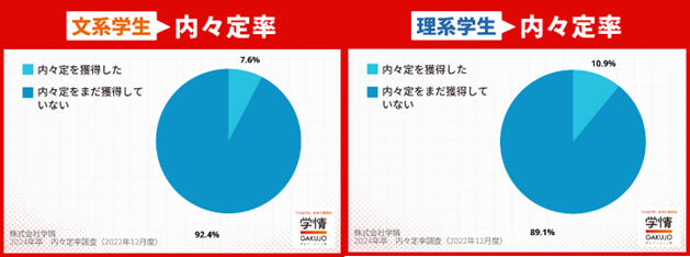 2024年卒学生の12月度の内々定率(11月末段階)は「8.7%」という結果に。前年同時期の「6.2%」を2.5ポイント上回りました。文理別では、文系「7.6%」、理系「10.9%」と理系が文系を上回っています。