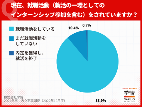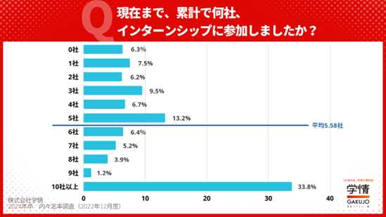 就職活動(就活を目的としたインターンシップ参加を含む)をしている学生は、「88.9%」と約9割にのぼりました。前年同時期を2.5ポイント上回っており、景気の回復や新型コロナウイルスによる行動制限緩和の影響などで、就職活動の進捗率はやや早めに推移していると考えられます。なお、インターンシップへの平均参加社数は「5.58社」。“10社以上”と回答した学生が最も多く、33.8%を占める結果となりました。