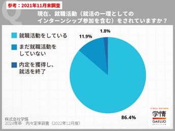 株式会社学情(本社:東京都千代田区)は、2024年3月卒業(修了)予定の大学生・大学院生を対象に、就職活動に関するインターネットアンケートを実施。今回は、「内々定の獲得状況」をテーマに調査しました。2022年11月末時点の内々定獲得率は、8.7%。前年同時期の6.2%を2.5ポイント上回りました。10社以上のインターンシップに参加した学生は33.8%にのぼり、早くも多くの学生が意欲的に就職活動に取り組んでいることが分かります。また、内々定企業の規模は従業員数“5,000人以上”が40.0%で最多という結果に。規模の大きい企業ほど早い段階で内々定出しを行っているとうかがえます。