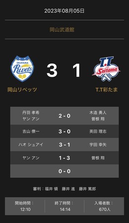 2023-08-05 一般社団法人Tリーグ ノジマTリーグ2023-2024シーズン公式戦 8月5日(土)開催 岡山リベッツ vs T.T彩たま 試合結果 Tweet ノジマTリーグ2023-2024シーズン公式戦 8月5日(土)12:00試合開始、岡山武道館にて開催されました 岡山リベッツ vs T.T彩たまの試合は、 3-1で岡山リベッツが勝利しました。 企業プレスリリース詳細へ PR TIMESトップへ 公式ツイッター Follow @Straightpress 最新情報をTwitterで受け取ろう! 公式フェイスブックページ 最新情報をFacebookで受け取ろう! 前の記事 一覧へ戻る 次の記事