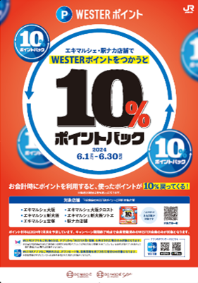 (株)ジェイアール西日本デイリーサービスネット(本社:兵庫県尼崎市 代表取締役社長 中西豊)は、お持ちの「WESTERポイント」(JR西日本グループ共通ポイント)をつかってお買い物していただいた方に、「つかったポイントが10%分戻ってくる!『WESTERポイント10%バックキャンペーン』」を実施します。ぜひこの機会にお持ちのポイントをご利用ください。