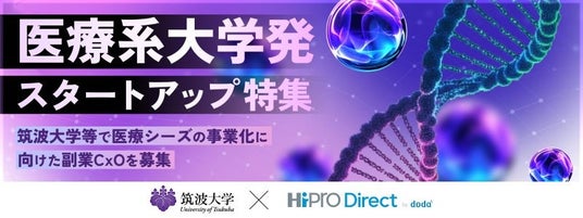 パーソルキャリア株式会社の副業・フリーランス人材 マッチングプラットフォームサービス「HiPro Direct」は、日本医療研究開発機構(AMED)の「橋渡し研究プログラム(大学発医療系スタートアップ支援プログラム)」拠点である国立大学法人筑波大学とともに、起業を目指す研究者または医療系スタートアップに対し、起業前(シーズS1)と起業後(シーズS2)※をサポートする経営支援人材のマッチング支援を行う運びとなりました。また、橋渡し研究支援機関として同プログラムの運営を担う筑波大学つくば臨床医学研究開発機構(T-CReDO)の体制を強化するために、2026年1月9日(金)よりプロジェクトマネジャーなどの支援人材の募集を開始します。