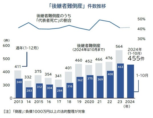 2024年1-10月に発生した、後継者がいないことで事業継続が困難になった「後継者難倒産」(負債1000万円以上、法的整理)は455件となった。過去最多だった2023年・564件とほぼ同水準(前年同期比1.7%減)で推移したものの、月次ベースでは2024年10月に過去最多の63件を記録するなど増勢ペースは加速している。通年では、2年連続で500件を上回る高水準での推移が見込まれる。