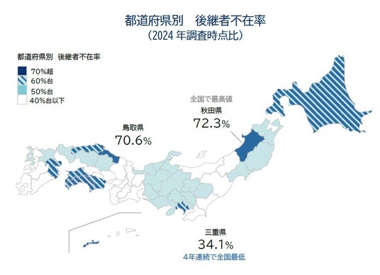 都道府県で最も不在率が低いのは「三重県」で34.1%だった。2021年以降、4年連続で全国最低水準となった。「地域金融機関などが密着して支援を行っていることに加え、経営や商圏が比較的安定している企業も多い」などの理由から、同族内で経営を引き継ぎやすい環境が整っていることなどが背景にある。同県では18年にピークとなる69.3%を記録して以降、不在率の急激な低下がみられたものの、22年を境に上昇傾向にある。この他、不在率が全国平均(52.1%)を下回る都道府県は23に上った。