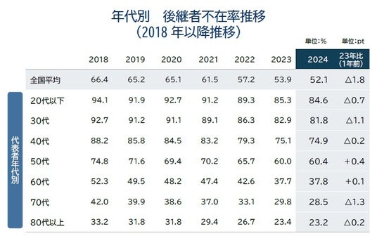 年代別:「50代・60代」で後継者不在率が悪化 「80代以上」は全年代で最低