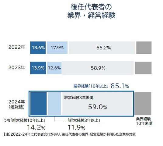 2022-24年の3年間で代表者交代が行われた企業のうち、後継者として就任した後任代表者の業界や経営経験の有無を分析した。その結果、24年は業界経験が「10年以上」ある後任代表者が8割超を占め、業界に精通した人材が多く代表者として就任した。このうち、「経営経験の有無」について分析したところ、最も割合が高かったのは「3年未満」(59.0%)で、多くがベテラン社員や役員として業界経験が長いものの、経営経験が少ない人材だった。一方、業界に明るく経営経験も豊富な人材が後任代表者として就任する割合も増えており、24年は業界・経営経験がともに10年以上の割合が14.2%を占め、22年(13.6%)から拡大傾向が続いた。