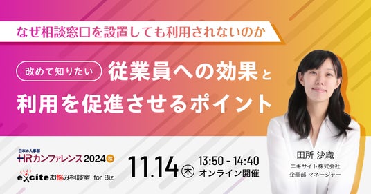 エキサイト株式会社(所在地:東京都港区、代表取締役社長:西條 晋一)は、株式会社HRビジョン主催の日本の人事部「HRカンファレンス2024-秋-」にて、当社Life&Wellness事業部・マネージャーの田所が登壇することをお知らせします。