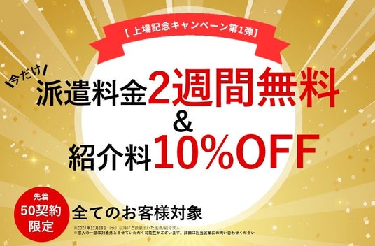 ※2024年12月18日(水)以降にご依頼頂いた派遣/紹介求人に限ります。 ※求人の一部は対象外とさせていただく可能性がございます。詳細は担当営業にお問い合わせください。