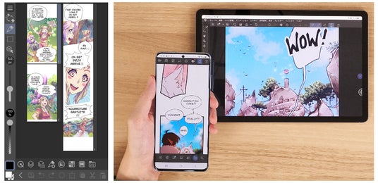 「CLIP STUDIO PAINT」は、デジタルでのイラスト、マンガ、Webcomic、アニメーション制作に最適なアプリです。縦長のWebcomic原稿の制作はもちろん、PCやタブレットで制作中のWebcomic作品の見映えをスマートフォンで確認できる機能など、Webcomicクリエイターを支援するさまざまな機能を提供しています。