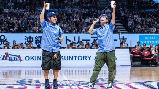 3月29日(土)に、キングスホームゲームの開催にあわせて、2月から沖縄アリーナの愛称となった「沖縄サントリーアリーナ」のお披露目セレモニーが実施され、ハーフタイムには沖縄サントリーアンバサダーを務めるHYの新里英之さん、名嘉俊さんのお二人によるサントリー流の乾杯音頭「スコール」の掛け声でお祝いの乾杯をしていただきました。