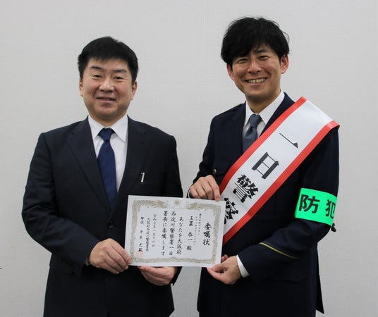 委嘱状を受け取る玉置恭一(右) 西淀川警察署 平生光範署長(左)