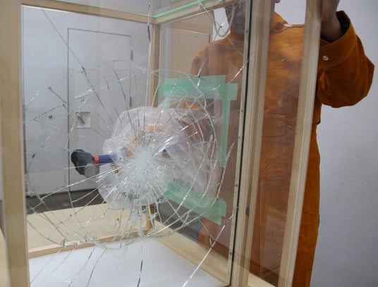 ダスキン サービスマスター事業による「防犯フィルム」を貼ったガラスの強度実験デモンストレーション風景