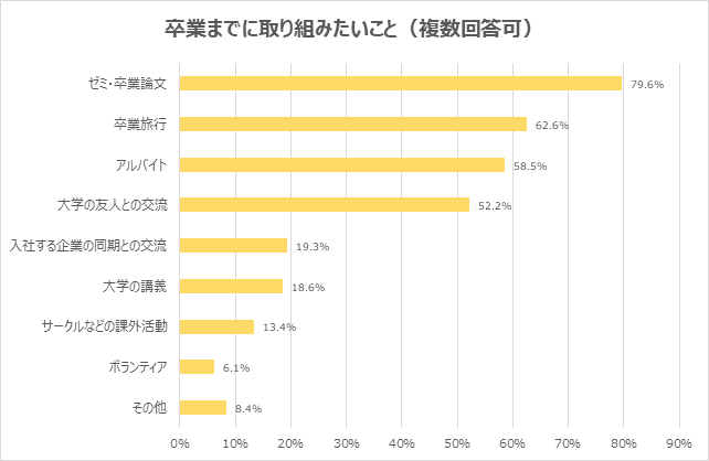卒業までに取り組みたいことは「ゼミ・卒業論文」が79.6%で最多。次いで、「卒業旅行」62.6%、「アルバイト」58.5%、「大学の友人との交流」52.2%が続きました。
