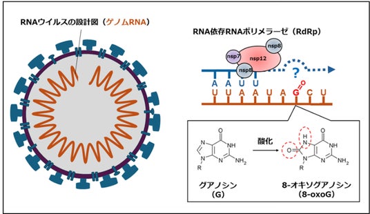 SARS-CoV-2のゲノムRNAの複製は、ウイルス由来の酵素である「RNA依存RNAポリメラーゼ(以下、RdRp)(注8)」が担っています(図1)。RdRpは、既存のゲノムRNAを鋳型とし、Aに対してU、Gに対してCを取り込むことで相補的なRNAを新たに合成します。本研究では、ROSによる主要なRNA損傷であるグアノシン(G)の酸化により生じる8-オキソグアノシン(8-oxoG)に着目し、RdRpが8-oxoGを鋳型とした際のRNA合成の挙動や変異誘発メカニズムを解析しました。