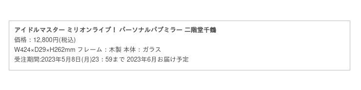 株式会社バンダイナムコアミューズメントは、『アイドルマスター ミリオンライブ! パーソナルパブミラー 二階堂千鶴』を4月20日(木)に発売します。「二階堂千鶴」は、「アイドルマスター ミリオンライブ!」に登場するアイドルの一人。10月21日生まれ、身長165cm、趣味はカフェでアパレル誌チェック。好きなものは憧れの目で見られることという東京都出身の21歳です。同日より株式会社バンダイナムコエンターテインメントが運営するECサイト、「アソビストア」にて期間限定の受注販売を開始します。
