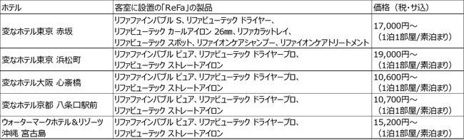 変なホテル東京 赤坂、変なホテル東京 浜松町、変なホテル大阪 心斎橋、変なホテル京都 八条口駅前、ウォーターマークホテル&リゾーツ沖縄 宮古島の5ホテルにて、大人気の美容ブランド「ReFa」の製品を設置した「ReFaルーム」を展開いたします。「ReFaルーム」では「ReFa」の製品を体験し、購入することが可能です。「美」を追求されるお客様にも、仕事後に気軽にご宿泊いただくお客様にもご満足いただける、「美」にこだわった充実したホテル滞在をご提供いたします。「ReFaルーム」には、「ReFa」のシャワーヘッド、ドライヤー、ヘアアイロンを導入し、LEDライト付き三面ミラーを設置、C.O.Bigelowまたは雪肌精のスキンケアセットをご用意しております。さらに、変なホテル東京 赤坂では「ReFa」の美容ロ―ラー、美顔器、シャンプー、トリートメントも導入しております。