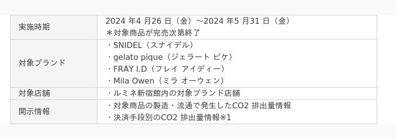 そこで、JCB は、JR 東日本・マッシュスタイルラボ・ルミネ・Arbor と協業し、ルミネ新宿にあるマッシュスタイルラボブランド(SNIDEL、gelato pique、FRAY I.D、Mila Owen)4 店舗で、CO2 排出量を開示し、消費者へどのような行動変容を与えることができるのかを検証する実証実験を行います。