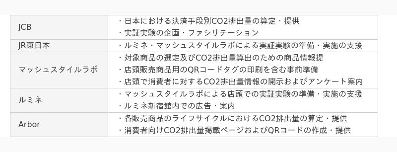 株式会社ジェーシービー (本社:東京都港区、代表取締役兼執行役員社長:二重 孝好、以下:JCB)は、東日本旅客鉄道株式会社 (本社:東京都渋谷区、代表取締役社長:喜㔟 陽一、以下:JR東日本)、株式会社マッシュスタイルラボ(本社:東京都千代田区、代表取締役社長:近藤 広幸、以下:マッシュスタイルラボ)、株式会社ルミネ (本社:東京都渋谷区、代表取締役社長:表 輝幸、以下:ルミネ)、Your Arbor Inc. (本社:カナダ カルガリー、CEO:Alex Todorovic、以下:Arbor)と共同で、商品別および決済手段別のCO2排出量可視化による消費者の行動変容を検証するための実証実験を開始します。