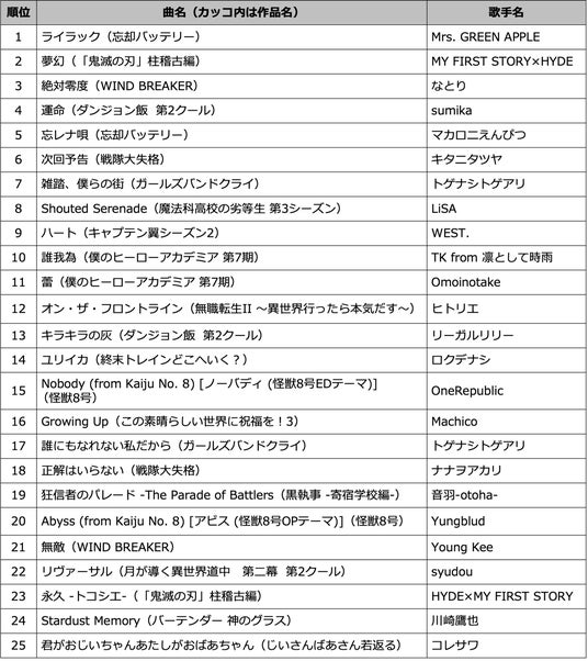 ■通信カラオケDAM 2024年春アニメ主題歌 カラオケランキング TOP50(1位~25位)