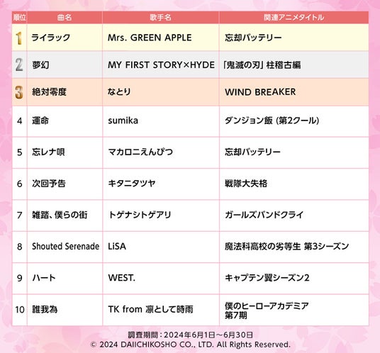 ※調査期間:2024年6月1日~6月30日 ※バージョンが複数ある楽曲は、同一曲として集計しています/放送が期をまたぐ作品で楽曲が前期と同じ場合は対象外となります。