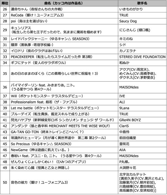 声優アーティストでは、Machico「Growing Up」(『この素晴らしい世界に祝福を!3』OPテーマ)が16位と大健闘していることも見逃せません。大作や話題作、人気シリーズの続編が豊作の春クールはアニソン・シーンも大盛況でした。