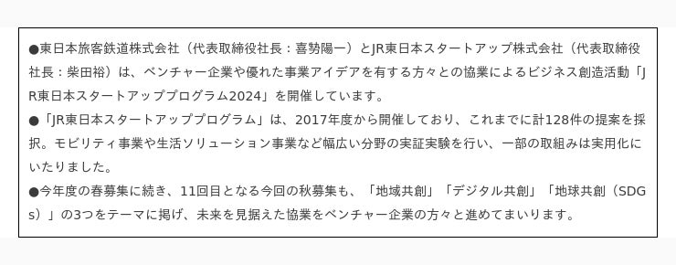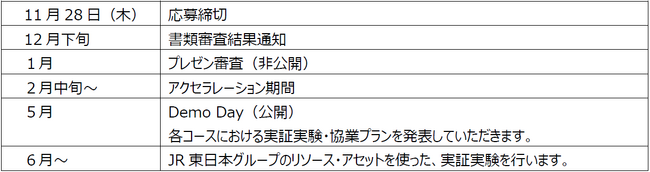 下記のとおり募集します。なお詳細についてはJR東日本スタートアッププログラム専用ホームページ(URL:https://jrestartup.co.jp/2024-entry-autumn/)をご参照ください。