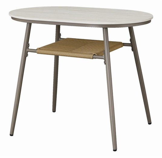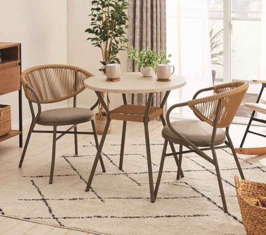 テーブルとチェアは共にスチールフレーム素材を採用し、さらに水に強い塗装を施しているため、屋外でも安心してお使いいただけます。デザインは3種類ご用意しており、お好みに合わせてお選びいただけます。いずれも落ち着いたカラーと自然素材の風合いで、お部屋の中でも外でも馴染みやすく、リラックスできる空間を演出します。