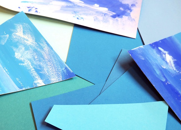 夏といえば空や海の青色!いろいろな青色の紙の中から好きなものをえらんで、展示室の壁をみんなで青く彩っていく参加型コーナー。たくさんの青色の中には、プレワークショップで子どもたちがつくった紙も使用する。