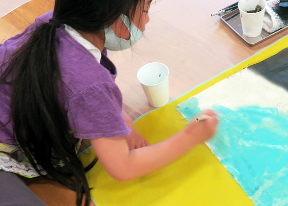 空や海をイメージして、絵具でオリジナルの青色の紙をつくるワークショップ。完成した紙は、会期中「みんなでつくるコーナー:どんどんひろがる!あおいろのカベ」の素材として来場者が使用する。