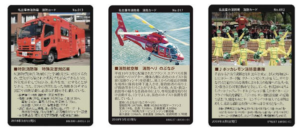 名古屋市消防局が使用している消防車や消防ヘリなどをデザインした、オリジナルのカードです。2022年4月1日現在で40種類あり、様々なイベントで配布しています。