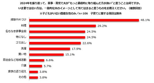 かねて、家オペレーションの負担は女性に偏っていると言われてきました。就労志向の既婚女性に「2024年を振り返って、夫は家事・育児に十分取り組んでいたと思いますか」と尋ねたところ「満足」「不満はない」あわせて53.2%、「不満」と回答した人の比率を上回りました。過去2年は不満の方が上回っていたこと、既婚女性以外から見た夫のイメージよりも「不満なし」と答えた人の比率が10ポイント近く高くなっていることなどから、夫の頑張りを認識している妻が増えてきていると感じます。ただ、お子さんの数が増えるほど不満の比率は上昇しており、育児が大変になるほど夫に期待することも増えていく状況が表れているのかもしれません。
