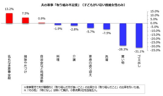 ・家事は女性がメインで行うものという感覚がどうしても抜けないようだ。名もなき家事については何度言っても存在自体が認識できない。結局自分がやったほうが早いのでやっている(50代:派遣社員)