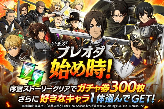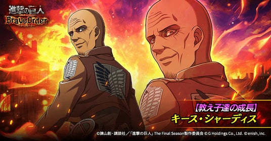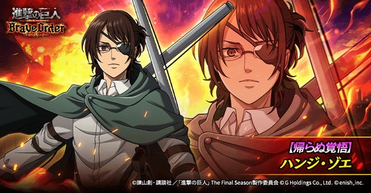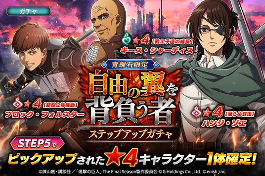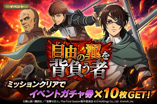 株式会社enish(本社:東京都港区、代表取締役社長:安徳 孝平、以下enish)は、アニメ『進撃の巨人』のスマートフォンゲーム最新作「進撃の巨人Brave Order」にて、2025年1月15日(水)より、自由の翼を背負う者を開催!また、本日より新登場の【帰らぬ覚悟】ハンジ・ゾエ、【新型立体機動】フロック・フォルスター、【教え子達の成長】キース・シャーディスがピックアップされた「自由の翼を背負う者ガチャ」も開催!その他、最新情報はゲーム公式サイト・ゲーム公式X(旧Twitter)アカウントにて随時公開して行きますので、ぜひご覧ください。
