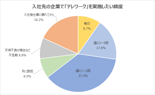 入社先の企業でテレワークを実施したい頻度は「週に1~2回」が37.3%で最多。次いで回答を集めた項目は、「入社後仕事に慣れてから」18.2%でした。「毎日」の回答は9.7%に留まっており、入社後は出社の機会を求める新社会人が多いことが分かります。