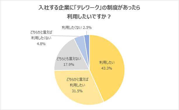 入社する企業に「テレワーク」の制度があったら「利用したい」と回答した新社会人が43.3%に上りました。「どちらかと言えば利用したい」31.5%を合わせると、テレワークの利用を希望する新社会人は7割に上ります。「出社とテレワークを組み合わせられると、メリハリのある働き方ができると思う」「集中力が必要な仕事など、テレワークのほうが進めやすい業務もある」「入社後すぐのテレワークは不安があるものの、業務に慣れたらテレワークも実施したい」「通勤時間がない分、効率良く働けると思う」といった声が寄せられました。