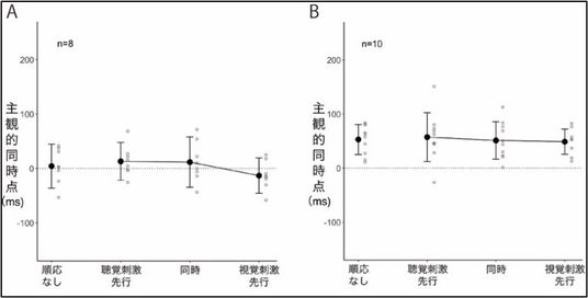 図2 順応段階とテスト段階とで開始時(A)もしくは終了時(B)に時間差を設けた条件の結果 (視覚刺激と聴覚刺激が同時に感じられるために必要な質問紙間の時間差を示す。正の値は聴覚刺激が視覚刺激に先行する程度を示す。)