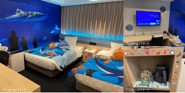 変なホテルでは、ホテル滞在も旅の目的、思い出の一つにしていただけるよう、名古屋の新名物スイーツ“ぴよりん”とコラボした「ぴよりんルーム」、恐竜で装飾した「恐竜ルーム」など、様々なコンセプトルームを販売しております。今回は、夏休みに向け、ご家族での旅行や動物好きのお客様にお楽しみいただける新たな特別企画として、「変なホテル鹿児島 天文館」にて、南九州最大の水族館「いおワールドかごしま水族館」とコラボレーションした客室「マリンルーム」を2023年5月29日(月)より発売いたします。