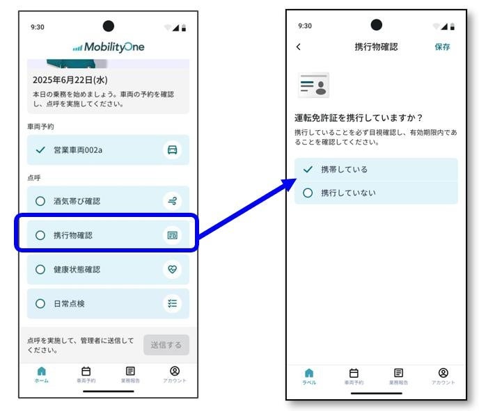「点呼機能」の確認項目「酒気帯び確認」「日常点検」に、ドライバーの「健康状態確認」と運転免許証の「携行物確認」を追加しました。安全運転管理者は、ドライバーや車両の状態をより多角的に確認できるほか、運用状況に応じて確認項目の数を柔軟に変更できます。