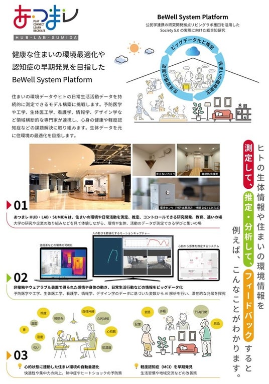 この施設は、包括連携協定を締結している墨田区と協力して2つの「場」を作ります。1つ目は、最新の研究技術を社会の問題解決のために具現化する研究開発の場です。2つ目は、地域住民が大学の研究や企業の取組みを見て触れて体験でき、様々な健康プログラムが受けられる多世代交流の場です。