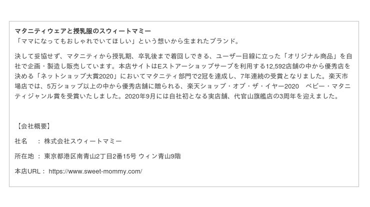 ・販売場所: スウィートマミー本店、楽天市場店、Yahoo!ショッピング店