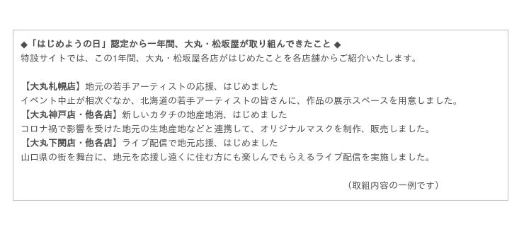 この記念日がきっかけとなって、どなたかが、ちいさくても前向きな一歩を踏み出されることがあれば、それは、大丸・松坂屋にとっても大きな喜びです。大丸・松坂屋各店舗からの「はじめようの日」をきっかけに生まれた企画や動画などを、ぜひご覧ください。