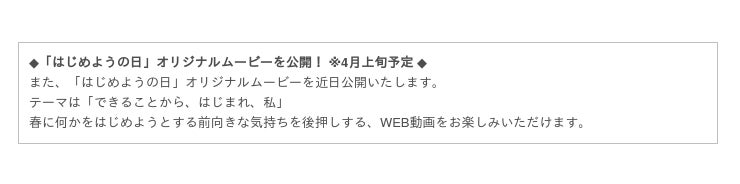 今年の3月21日の記念日は「はじめようの日」特設サイトを開設し、この一年間の取り組みやお客様を元気にするオリジナルムービーを公開いたします。