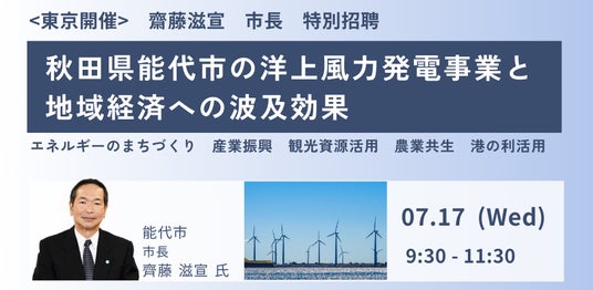 JPI(日本計画研究所)は、秋田県能代市 市長 齊藤 滋宣 氏を招聘し、洋上風力発電事業と地域経済への波及効果について詳説いただくセミナーを開催します。