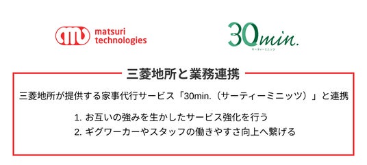 ソフトウェアを主軸に、空間の価値を最大化するソリューション「StayX」を運営するmatsuri technologies株式会社(本社:東京都新宿区)は、三菱地所株式会社(本社:東京都千代田区、以下、三菱地所)の提供する家事代行サービス「30min.(サーティーミニッツ)」(以下、30min.)と連携してサービス提供致します。