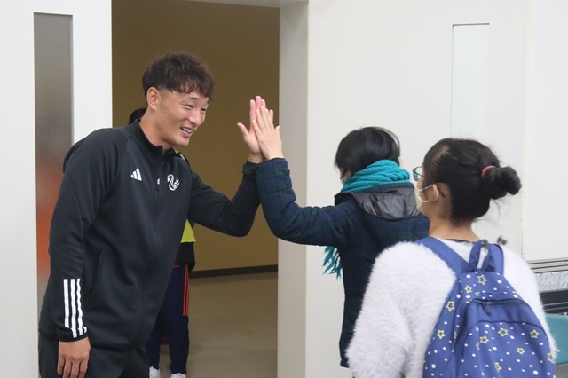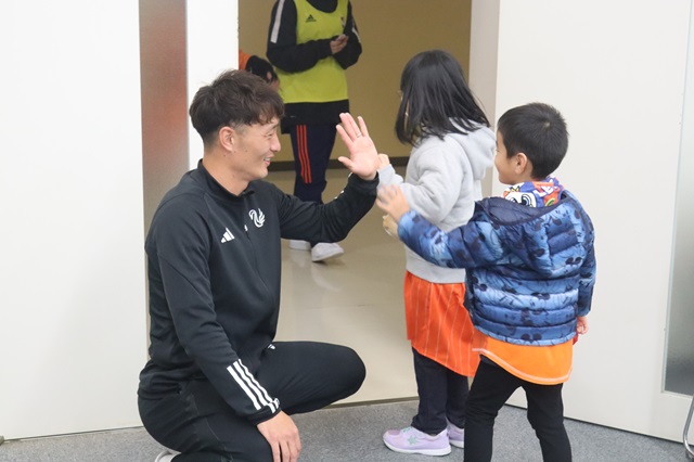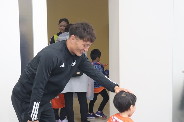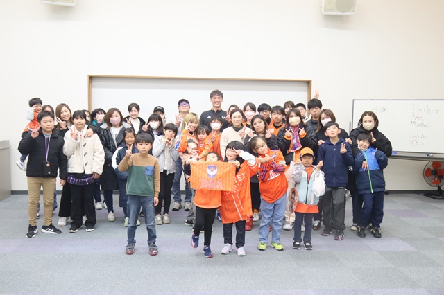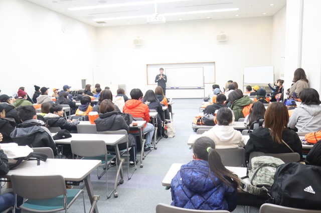 試合終了後には、田上大地選手との交流会を実施しました。ホワイトボードを使い、身振り手振りを加えながら、子どもたちと保護者の皆様に、情熱を持って語りかけていました。