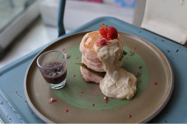 中でも注目は、当店の人気ナンバーワンスイーツであるヴィーガン&グルテンフリーパンケーキ。桜色のパンケーキは、ふわふわ食感な桜味の生地に豆乳クリームとあんこを添えて、和を感じる味わいに。