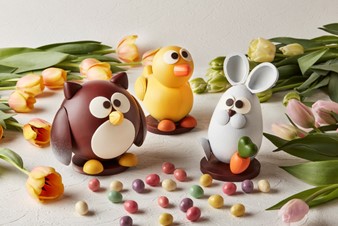 イースターのお祝いにふさわしい、動物をモチーフにした愛らしいチョコレートです。多産で繁栄のシンボルとされるうさぎ、生命を秘めた豊穣のシンボルである卵から生まれるヒヨコ、幸運のシンボルで縁起が良いとされるフクロウを、卵型のチョコレートを組み合わせて形づくりました。うさぎが持っている人参の葉、ヒヨコとフクロウのしっぽは、ハート型にしてデザインのアクセントに。世界中のパティシエに愛されるヴァローナ社のチョコレートを贅沢に使用しています。